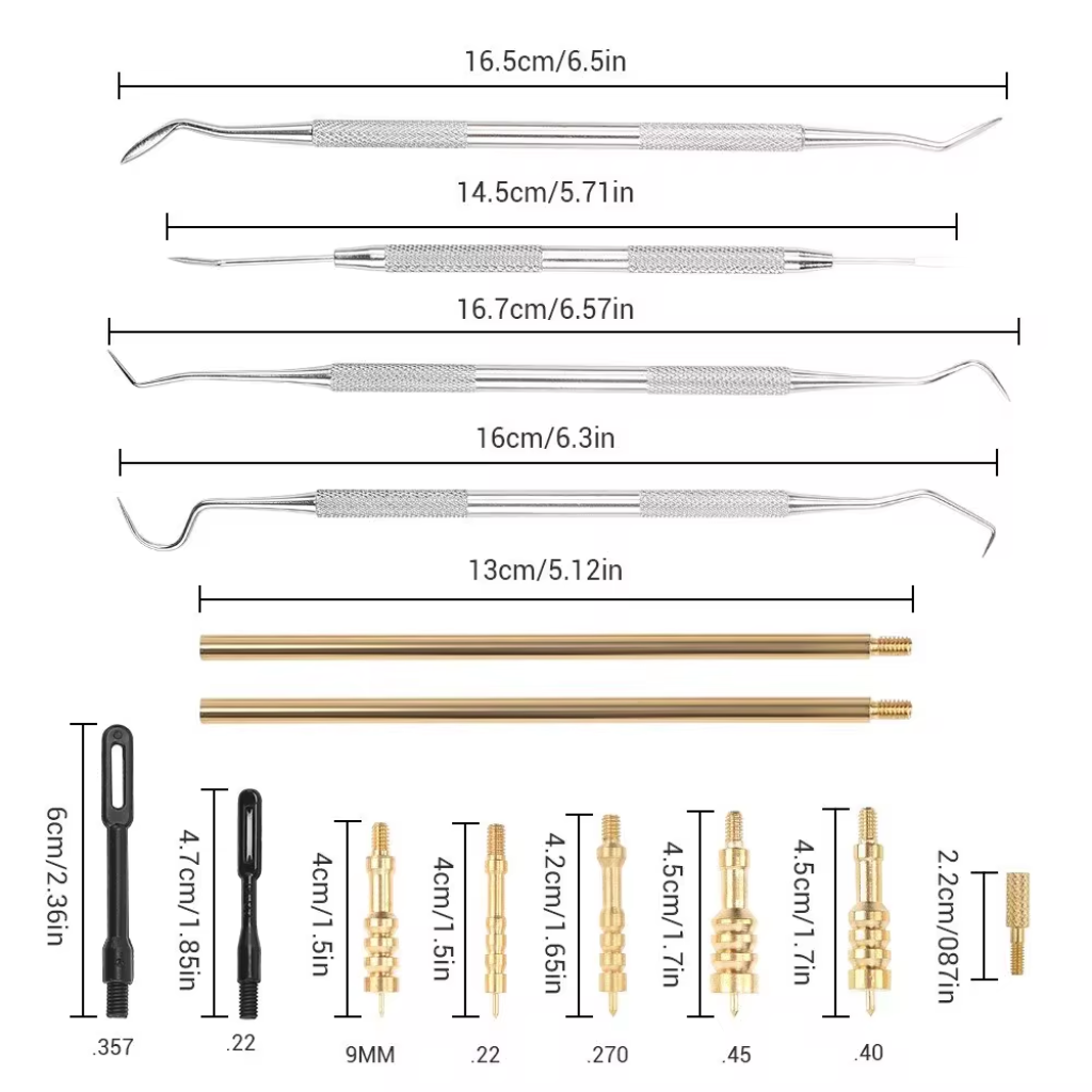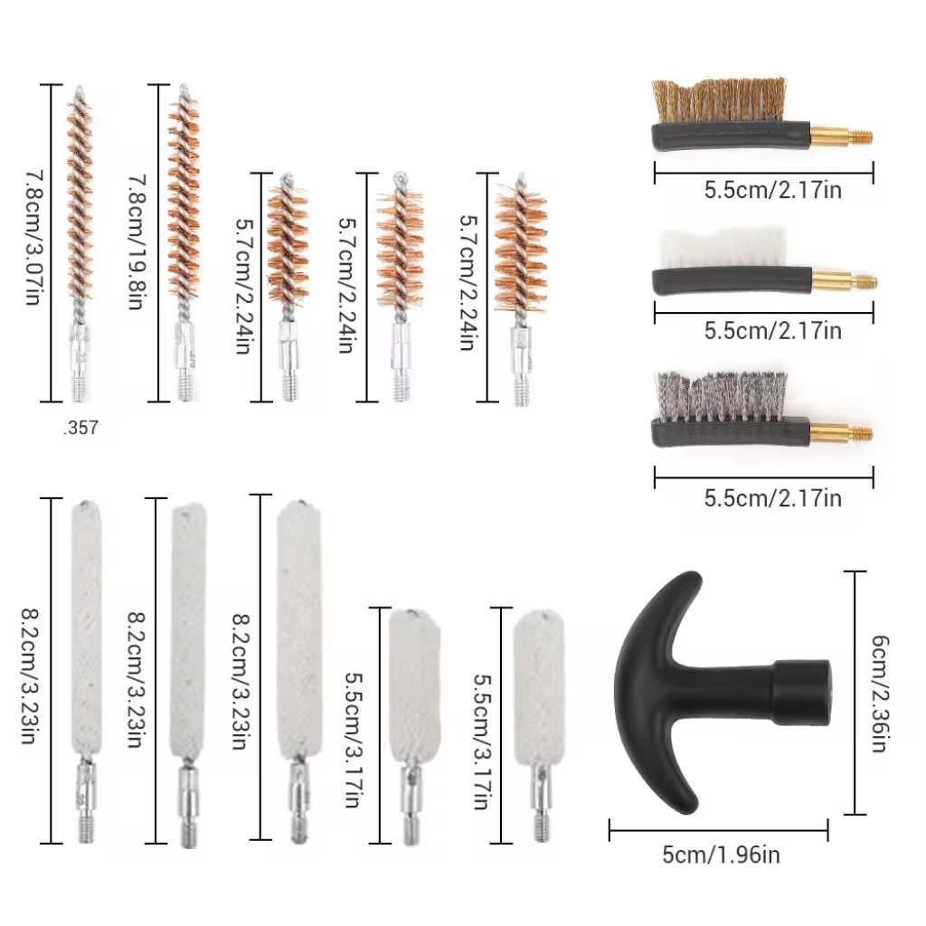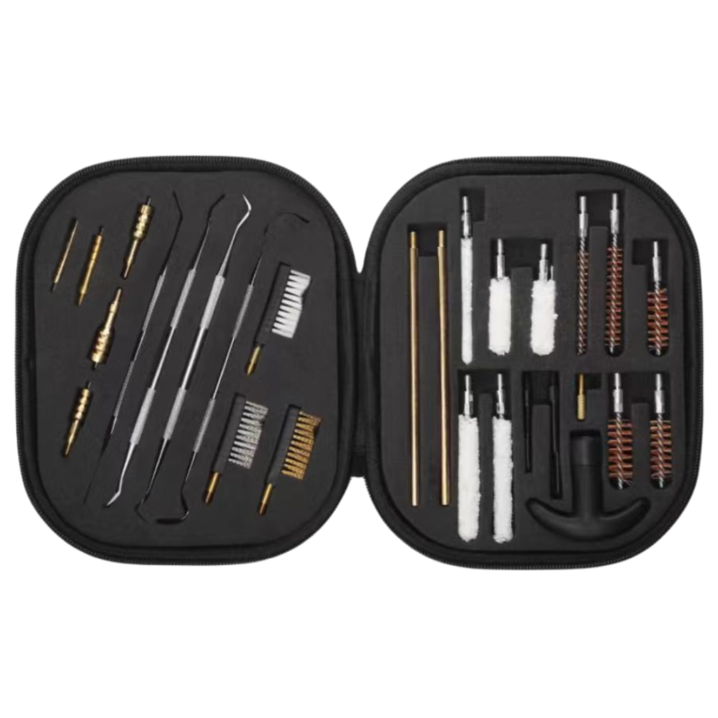 Maintain the upkeep your firearms with the Shooters Mart 29 Piece Universal Gun Cleaning Kit. This all inclusive kit offers a complete set of essential tools to effectively maintain your collection. Safely carry and protect your cleaning supplies in the premium portable and lightweight case. Used for .17/.22/.270/.280/.30/.357/.38/9mm/.40/.410/.44/.45 calibres.