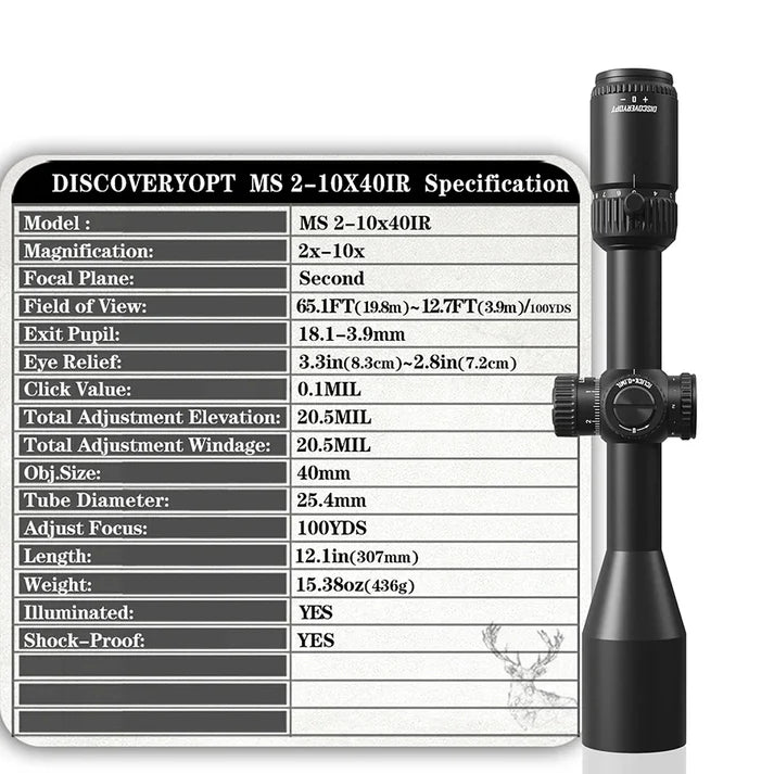 Discover the precision and clarity that the Discovery Optics MS 2-10X40-IR Scope provides. With 2-10X magnification and a 40mm objective lens, this scope offers a clear and accurate view. The built-in illuminated reticle enhances visibility in low light conditions, making it a versatile choice for all your shooting needs.