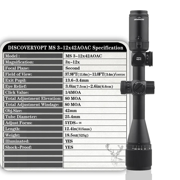 Discover the ultimate precision and clarity with the Discovery Optics MS 3-12X42AOAC Scope. With a range of 3-12X magnification and an adjustable objective, this scope allows for unparalleled accuracy at any distance. Dominate on the shooting range with this industry expert-approved and constructed scope.
